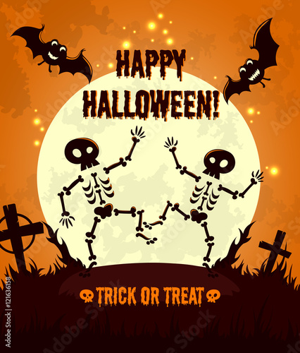 Halloween Night Background With Full Moon Cute Dancing Skeletons